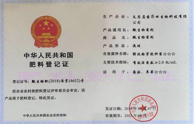 图七:国家农业主管部门颁发的微生物菌剂证明 |