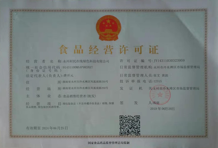 2019年6月26日,适逢联合国宪章日及第32个国际禁毒日,来自新当选的联合国粮农组织总干事屈冬玉博士故乡——中国湖南永州,致力为世界华人乃至全人类提供健康食品与安全网络服务的创新企业——永州村民在线绿色科技有限公司取得了食品经营许可证。
