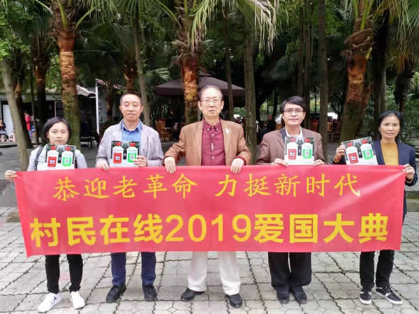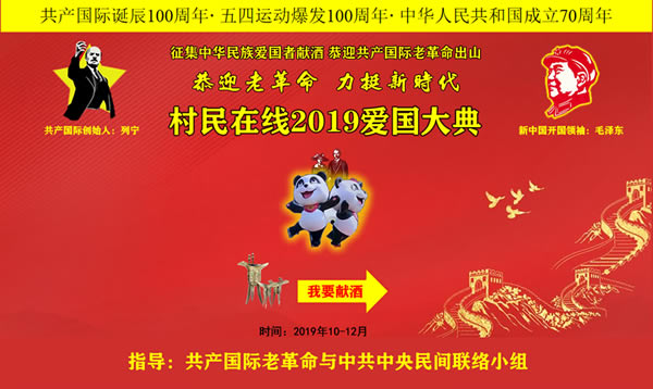 2019年系共产国际诞辰100周年、五四运动爆发100周年、中华人民共和国成立70周年,为征集中华民族爱国者献酒,恭迎共产国际老革命出山,力挺新时代,金秋十月国庆、重阳前后,由共产国际老革命与中共中央民间联络小组指导,中国爱国品牌协会同根圆公社、北京怀素书画院马义豪艺术馆、永州村民在线绿色科技有限公司主办,献礼中华洞府老革命网、村民在线各地爱国吧承办,钓岛生态科技有限公司、重阳民间诗酒节互动群协办,多个机构支持的“恭迎老革命 力挺新时代”村民在线2019爱国大典在网上、网下分布启动。 “恭迎老革命 力挺新时代”村民在线2019爱国大典暨“九九归一”全民行动旨在迎接守护中华民族国家遗留物质和精神财富的中华洞府老革命(303)组织出山,彻底粉碎“民族资产解冻”骗局,力挺以习近平总书记为核心的党中央带领全国各族人民推动并实现中华民族伟大复兴中国梦。该活动9月13日发布《关于举办“重阳民间诗酒节”的倡议书》开始酝酿,第一期活动为期一周,从重阳前夕(10月6日)《献礼中华洞府老革命网》开通开始至10月13日著名华侨领袖刘建吉先生带队组团赴成都慰问老革命圆满结束。 9月13日中秋节,《毛泽东颂》慈善艺术五洲行组委会(北京怀素书画院代章)向全国各族人民发出了《关于举办“重阳民间诗酒节”的倡议书》,倡议书中写到——“琴棋书画诗酒花茶”为中华文人八雅,其中酒独占一席。重阳节酿酒祭酒,同时孝敬老人,缅怀老一辈是最好不过的。因此,共产国际老革命与中共中央民间联络小组提议《毛泽东颂》慈善艺术五洲行组委会牵头北京怀素书画院马义豪艺术馆、永州村民在线、哈尔滨申氏酒业、中国雷锋精神网、早商网爱心超市、同根圆国货公社、香港中国爱国品牌协会、中华和平与发展促进会、一带一路世界和平与发展峰会、世界华人有机组织、黄埔世家品牌联合体、湖南荣御文化传播有限公司,并邀请茅台镇十四君酒业、荣氏家族酒、延川红枣酒、湖南舂陵王酒业及更多品牌酒厂共同倡议——将农历九月初九为“重阳民间诗酒节”。 9月15日,唐开元(字良闻,笔名马义豪)发表了《重阳民间诗酒节创意2008从北京鸟巢飞出》一文,详细介绍了重阳民间诗酒节创意的起源,将重阳民间诗酒节的创意追溯到他在担任贺龙元帅亲属秘书期间。那是2008年7月,在北京鸟巢应北京奥运开闭幕式导演组邀请出席奥运彩排,他在听取著名策划家韩颐和先生介绍他的酒包装专利时的,唐开元灵光一现构想是不是可以设立东方酒节(后来更名为重阳民间诗酒节,当时构想了88国际和谐日,后来成功启动)。 10月1日,看了建国70周年国庆大典(含国庆阅兵、群众游行、联欢活动),与孙中山先生同时代,至今健在的共产国际老革命领导的——中华洞府老革命组织(303组织)心情非常舒畅,久久不能平复,对以习主席为核心的中共中央充满信心,对中华民族伟大复兴充满信心! 10月6日(农历九月初八)重阳节前夕,建国70周年国庆假期又喜逢重阳,重阳节是敬老节,为拥抱新时代,迎接守护中华民族国家遗留物质和精神财富的中华洞府老革命组织出山,彻底粉碎“民族资产解冻”骗局,共产国际老革命与中共中央民间联络小组授权中共核心创始人李达同志家乡机构“永州村民在线绿色科技有限公司”开通——献礼中华老革命网开通,并向重庆著名华侨领袖刘建吉、保定籍著名书法家康殿英、永州籍著名诗人南蛮、国民美酒生产方哈尔滨申氏酒业及全国各族爱国人士、爱心人士发出了《重阳民间诗酒节为中华洞府老革命颂诗献酒邀请函》。 邀请函发出去以后,立即得到各地爱国、爱心人士回应,来自中共诞生地——浙江嘉兴的村民在线董事蓝英及在四川内江的母亲率领刚从部队退役回来的亲属给老革命带头献酒,紧接着重庆女士曾德会、来代琼、杨宗强,陕西延川县伏义农业专业合作社创始人郭海燕,湖南永州的《村民在线》总编助理唐良图之子(在备战高考,暂不透露姓名)纷纷通过网站给老革命献酒。献礼中华洞府老革命网通知“国民美酒”生产方哈尔滨申氏酒业抓紧筹备,延川乾坤湾红枣酒也表示了积极配合,在设计酒瓶。 刚从中央红军长征出发地江西赣南瞻仰红色圣地返回重庆的《村民在线》理事会名誉主席、著名华侨领袖——中国老区建设基金会海外顾问、中国杰出刘氏宗亲联谊会主席、国际华人华侨联合总会荣誉主席刘建吉先生闻讯后,对村民在线成员爱国热情表示了肯定,尤其对重庆代表寄于厚望。他带领重庆商界代表刘中仁先生、来代琼女士,并与四川内江渔民代表苏全芳女士在陈辉、唐开元引导下,与10月13日(世界保健日)上午奔赴成都武侯区金花街道,在某公园与中华洞府老革命(303)组织外联总管老前辈会面。刘建吉主席一行现场展示了印有马义豪诗歌《献礼中华洞府老革命》的国民美酒设计图,并当场献礼、敬酒,以表示“醉”崇高的敬意!老总管给刘主席等人介绍组织部分内部情况,并就邀请更多爱国、爱心人士慰问老革命交换了意见。陈辉、唐开元现场转达了民间联络小组王磊组长给老革命的问候,并给大家答疑解惑,部分人士现场办了有关手续。 同一天,永州市原政协委员、永州村民在线绿色科技有限公司总经理甄仕荣夫妇与永州市公务员代表李国林及部分中共永州市冷水滩区非公有制综合党委凤凰
