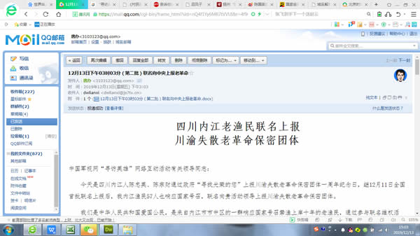 下午03点03分,王有机、刘红兵、唐国明、游泳、肖前胜等57位来自共产国际老革命与中共中央民间联络小组驻地内江市市中区的一群响应国家号召禁渔上岸十年的老渔民,在渔民家属苏全芳的指导下,第二批联合署名,并附带共产国际老革命与中共中央民间联络小组联络员陈辉、唐开元二位同志的身份证号码、手机号码,向中央军委政治工作部网络舆论局、中央网信办网络新闻信息传播局、退役军人事务部思想政治和权益维护司指导,解放军新闻传播中心主办 ,解放军新闻传播中心广播电视部、中国军视网承办的“寻访英雄”网络互动活动唯一官方网站——《中国军视网》(www.js7tv.cn)成功上报了川渝失散老革命团体。