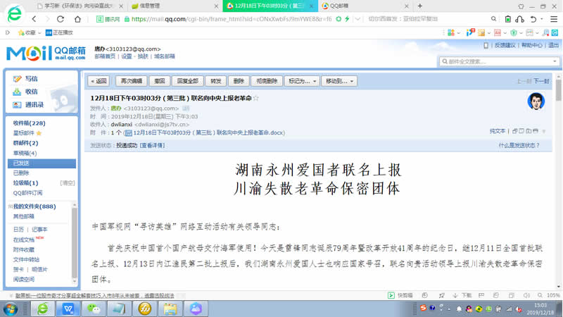 下午03点03分,甄仕荣、张宝英、甄贤高、李国林、唐才亮、唐垂锋、唐爱平等52位来自中共创始人李达同志、红八军顾问唐克同志家乡——湖南永州的爱国人士作为第三批联名(署身份证姓名及身份证号码)的爱国人士,附带共产国际老革命与中共中央民间联络小组联络员陈辉、唐开元二位同志的身份证号码、手机号码,向中央军委政治工作部网络舆论局、中央网信办网络新闻信息传播局、退役军人事务部思想政治和权益维护司指导,解放军新闻传播中心主办 ,解放军新闻传播中心广播电视部、中国军视网承办的“寻访英雄”网络互动活动唯一官方网站——《中国军视网》(www.js7tv.cn)成功上报了川渝失散老革命团体。