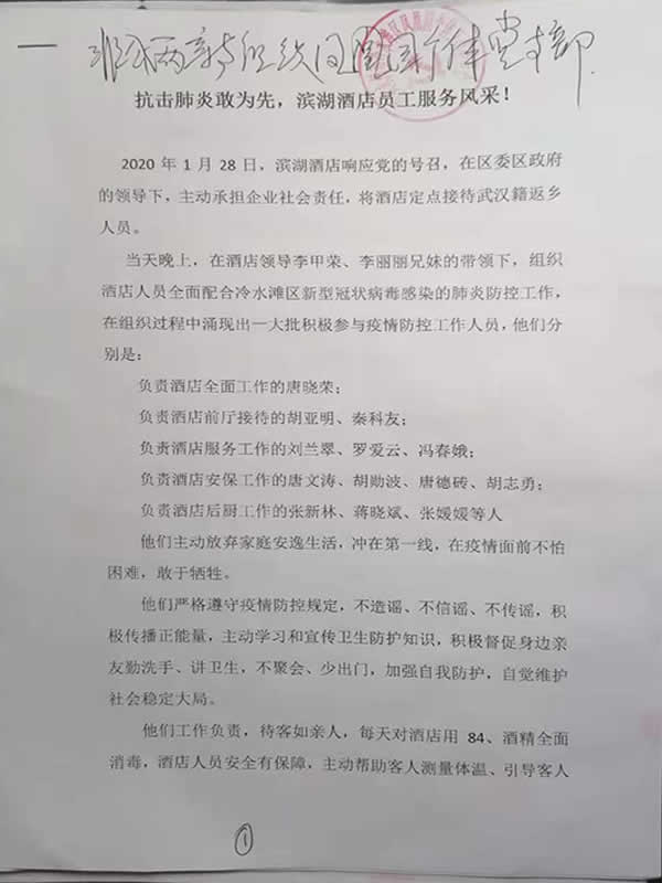 2020年2月2-3日,原永州市人民政协委员、中共永州市冷水滩区非公经济综合党委凤凰园党支部书记、永州村民在线绿色科技有限公司总经理甄仕荣同志带队深入从武汉返湘人士集中接待点——永州市冷水滩滨湖大酒店一线检查防疫和接待工作,并现场接受六位员工火线入党申请,并随即以所在党支部名义发出了爱心捐款支援重灾区倡议。