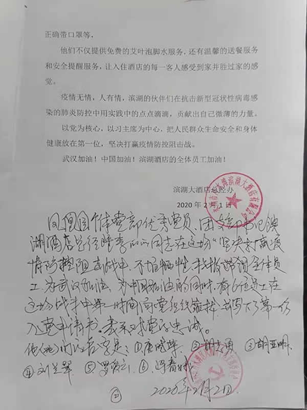 2月2日,在甄仕荣、李丽丽等同志见证下,滨湖大酒店奋战在抗疫一线的员工唐晓荣、胡志勇、胡亚明、刘兰翠、罗爱云、冯春娥六位同志申请火线入党,他们矢志要为武汉加油,为中国加油,在湖南永州冲在抗疫一线,不怕牺牲,坚决打赢防控保卫战。