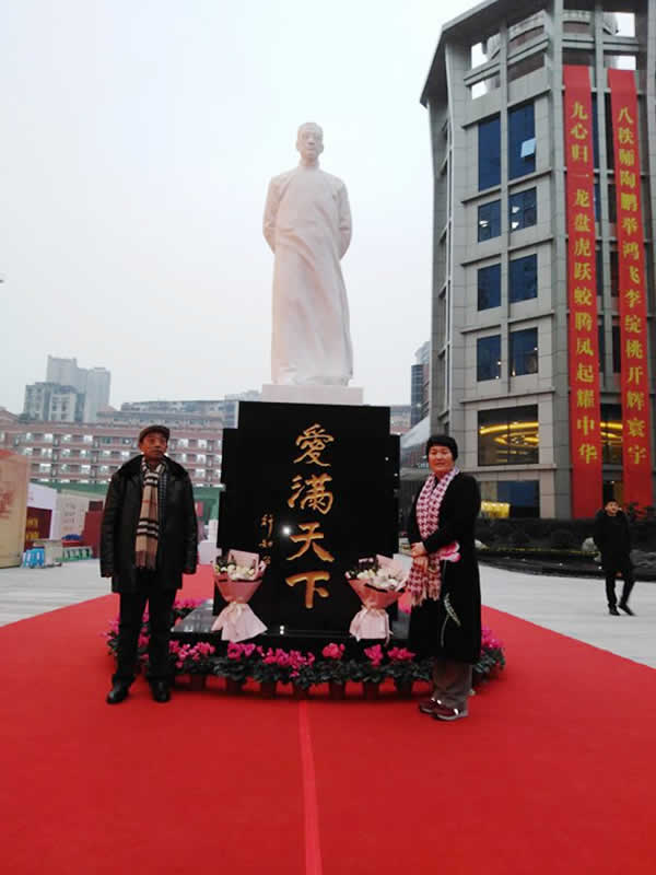 图1:刘友开、陈素珍夫妇在重庆育才中学陶行知先生雕塑像前合影