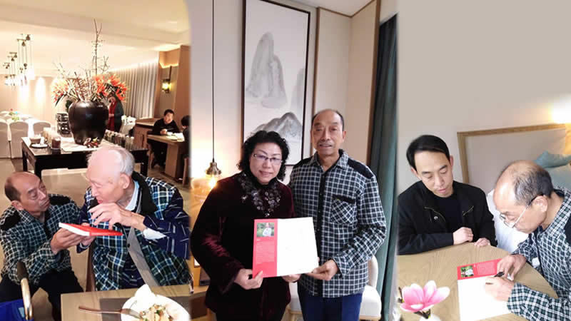 图12:刘友开老师在重庆向领导、嘉宾、市民题赠《一群小好汉群英谱》诗集 (左2:95岁高龄重庆育才校友吕长春老先生、左3:《中国陶行知研究》常务副主编叶小妹、右2:重庆九龙坡区二郎派出所唐亮教导员)