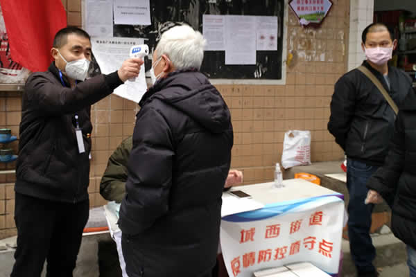 图四:疫情防控值守点工作人员在给出入居民在量体温