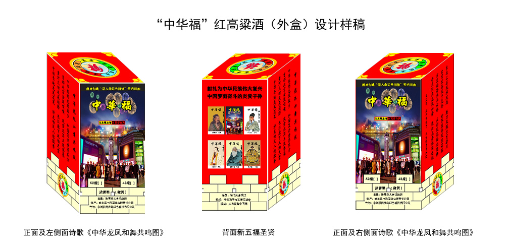 牛中社2020年4月1日讯(通讯员甘当梯)4月1日,由陶门大唐学派CEO唐良闻主导策划推出的“中华福”高粱酒包装设计完毕,连夜出炉。该酒由世界华人有机组织出品,拟作为倡导构建“华人命运共同体”签约用酒。拟委托哈尔滨申氏酒业有限公司生产,永州村民在线绿色科技有限公司营销。