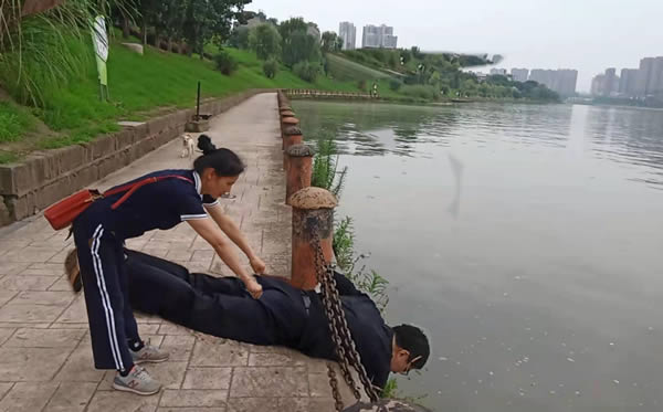 此时,湖畔路人稀少。幸好,陈女士发现不远处有两个青年男子,于是,她一边招手一边呼救。两位男子闻讯跑来(其中一个就地找了两根树枝),三人都不会水,也没有救落水人的经验,无法下水救人,水面距离路面约一米,两位没有任何迟疑,立刻扑下身子贴近地面,一个拿着树枝递给老人,一个直接伸手救人。