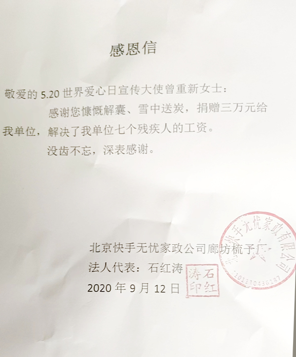 图五:5.20世界爱心日大使曾重新为助残事业贡献爱心收获感谢信