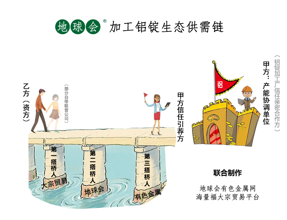 地球会有色金属网(2025.12.3 通讯员 马义豪)鉴于铝价上涨,受环保等因素影响,中国铝锭加工产能有限,造成市场上铝锭供应少,氧化铝粉加工铝锭的需求增多,海量福大宗贸易平台、地球会有色金属网联合有关单位共同推出了地球会加工铝锭生态供需链,为真正的买家与卖家搭桥。 以上的示意图表明:有的单位(或个人)有真实的需方(资方、买家)源头,那么将其列入地球会旗下——海量福大宗贸易会员,作为第一搭桥人;有的单位(或个人)有真实的供方(加工方、卖家)源头,那么可以将其列入地球会有色金属网会员,作为第三搭桥人。地球会自身作为第二搭桥人。这样,真实的需方(资方、买家),安全通过第一、第二、第三搭桥人(三个桥墩),由地球会全体成员搭建的这座结实的桥梁,引荐给铝锭加工方的联营机构,从而减轻买家直接找卖家,给卖家带来的各种不必要的压力。 在目前情况下,为了各方利益关系平衡,地球会加工铝锭生态供需链的及时出台,将有利于各方找到自己的位置,掌握自己的进度,各就各位,稳定好中国有色金属的供应链。(编辑:唐良闻) |